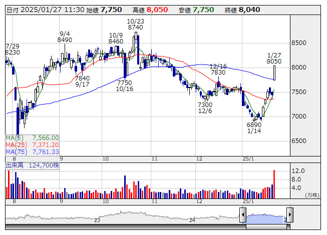 大幅反発。先週末に24年12月期の決算を発表している。営業利益は75.3億円で前期比5.4%減となり、従来予想の80億円は下回ったが、第3四半期累計時点での前年同期比18.0%減から減益率は縮小している。また、25年12月期は83.4億円で前期比10.8%増の見通しとしており、ポジティブな反応が優勢になっている。製品価格の見直しを機動的に行うなど、収益性の改善を図っていくとしている。