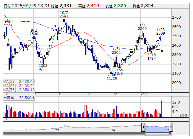 2025年01月29日13時33分 【材料】中部鋼鈑は大幅続落、製鋼工場事故など影響し25年3月期業績予想を下方修正 中部鋼鈑 <日足> 「株探」多機能チャートより 中部鋼鈑<5461>は大幅続落している。28日の取引終了後、25年3月期の連結業績予想について、売上高を608億円から500億円(前期比26.2%減)へ、営業利益を62億円から18億円(同82.7%減)へ、純利益を44億円から12億円(同83.2%減)へ下方修正したことが嫌気されている。 新電気炉の更新に伴う生産制約が想定を上回り販売数量の下振れを余儀なくされたことに加えて、1月21日に製鋼工場の電気炉周辺において炉外溶鋼漏れに起因する水蒸気爆発事故が発生し、現在操業を休止している影響で第4四半期の生産・出荷の大幅な減少が見込まれることなどが要因としている。 出所:MINKABU PRESS
