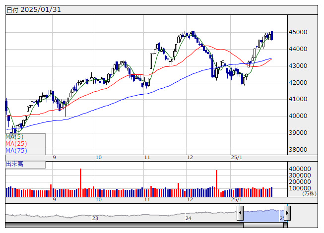 PCEコア価格指数でサプライズなく、金利低下で寄り付き後、上昇。トランプ政権による関税発動が3月まで先送りされるとの報道が好感され一段高となった。その後、政府の報道官が報道を否定し、2月1日から関税を開始する計画にかわりはないことを明らかにしたため警戒感が強まり売りが加速し下落に転じた。アップルの決算を好感し大きく上昇していたナスダックも下落に転じ、相場は終盤にかけ下げ幅を拡大し、終了。セクター別では、自動車・自動車部品が上昇した一方で、耐久消費財・アパレルが下落した。