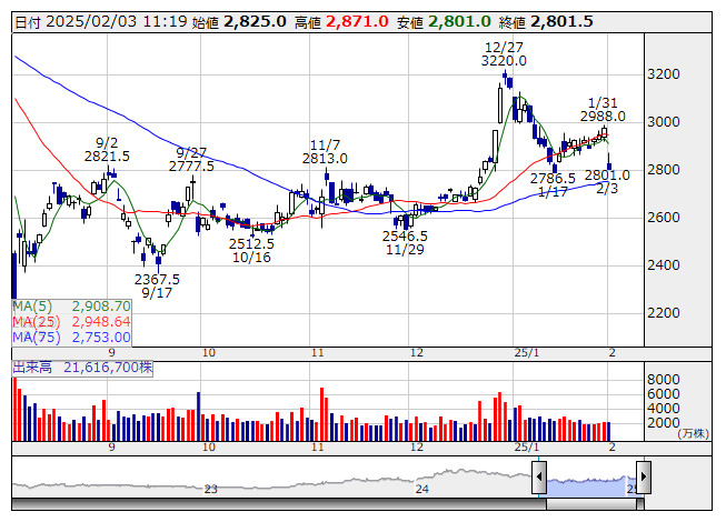 7201>は一時10%安となるなど、自動車株への売り圧力が強まっている。トランプ米大統領が1日、カナダとメキシコからの輸入品に対し4日から25%の関税を課す大統領令に署名した。中国に対しては10%の追加関税を課す。関税強化の方針は事前に伝わっていたが、世界経済に対するマイナス影響が改めて意識され、投資家のリスク許容度が下向いた。自動車株に対してはサプライチェーンを含め生産面に与えるネガティブな影響が懸念され、売りが促された。マツダ<