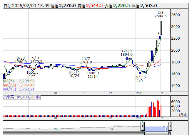 4676>が急反発し、2007年以来の高値圏で推移している。同社子会社のフジテレビジョンは、元タレントの中居正広氏を巡るトラブルが報じられたのを機に社会的な関心を集めることとなった。1月30日の取引終了後、フジHDは広告収入の大幅な減少を理由に25年3月期業績予想の下方修正を発表。直近で急ピッチな株高が進んだのを背景に翌31日の同社株は利益確定目的の売りが優勢となったが、下値では押し目買いを集め下げ渋る格好となった。週明け2月3日は全体相場がリスク回避ムードに包まれたものの、PBR(株価純資産倍率)が1倍を下回り、9月末時点の自己資本比率が約59%と財務健全性を持つ同社株に対しては買い需要もあって、一時的な調整を見込んで売り持ち高を構築した投資家の買い戻しを誘発し、株高に弾みがついたとみられている。
