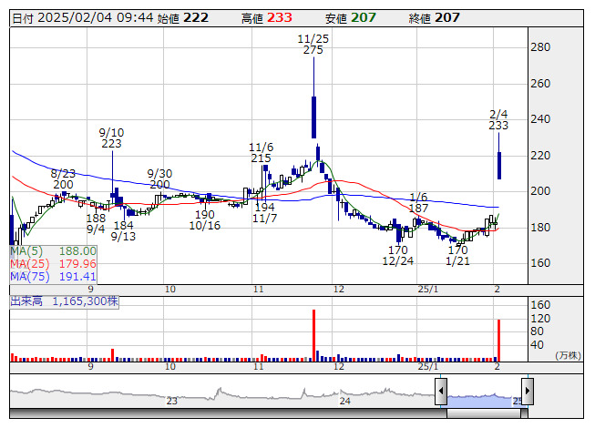 7719>が切り返し急。3日の取引終了後、CAEソフトウェアの開発や受託解析サービス、AIソリューションなどを手掛ける先端力学シミュレーション研究所(東京都文京区)の株式の過半数を取得して子会社化し、新規事業としてデジタル事業を開始すると発表。これを材料視した買いが入ったようだ。取得価額は概算で3億6000万円。両社はデジタルツイン技術を駆使したソリューションの提供などを目的に、2024年3月に資本・業務提携に向けた基本合意書の締結について発表していた。株式の取得は同年4月下旬以降を予定していたが、特別注意銘柄の指定が継続したことを背景に延期。11月23日付の指定解除を受け、最終的な契約の締結に向けて協議を行い、合意に至った。