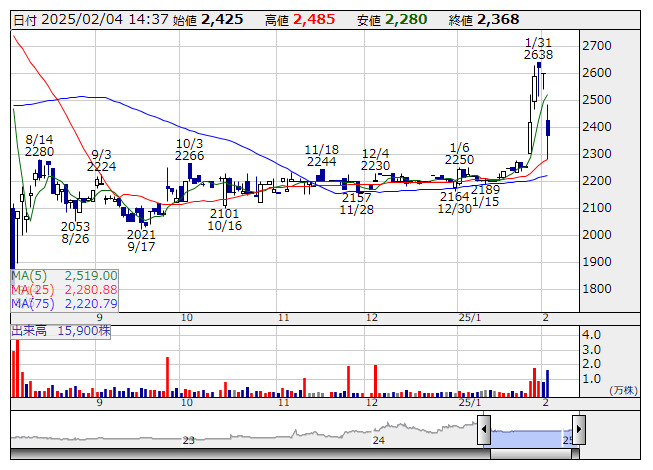 2025年02月04日14時38分 【材料】阪神燃は大幅続落、第3四半期営業益73%減で通期計画進捗率26% 阪神燃 <日足> 「株探」多機能チャートより 阪神内燃機工業<6018>が大幅続落となっている。同社は3日取引終了後、25年3月期第3四半期累計(24年4~12月)の単独決算を発表。営業利益は前年同期比73.1%減の1億1800万円となり、通期計画の4億5000万円に対する進捗率は26.2%となった。 生産量の増加で売上高は同20.5%増の83億7200万円となったが、資材価格高騰によるコストアップと、その価格転嫁が進んでいないことが利益面に影響した。なお、通期業績予想については従来計画を据え置いている。 出所:MINKABU PRESS