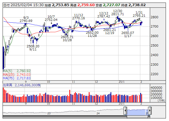 2025年02月04日15時47分 【市況】TOPIX先物:4日清算値=5.5ポイント高、2736ポイント TOPIX <日足> 「株探」多機能チャートより 4日15時45分、TOPIX先物期近2025年3月限は前日清算値比5.5ポイント高の2736ポイントで取引を終えた。出来高は5万5991枚だった。この日のTOPIXの現物終値2738.02ポイントに対しては2.02ポイント安。 株探ニュース