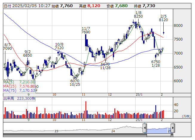 加えて同社は4日終値7160円で、5日午前8時45分の東証の自己株式立会外買付取引(ToSTNeT‐3)において上限40万株(自己株式を除く発行済み株式総数の1.6%)の自社株買いを実施すると発表。東証の自己株式立会外買付取引情報によると、ダイヘンは上限となる40万株の買い付けを同日に行った。2月14日に自己株式40万株を消却する予定。