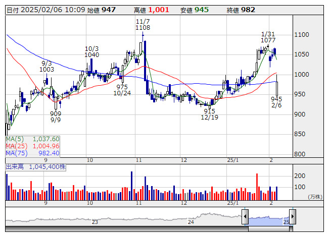 2025年02月06日10時09分 【材料】カナデビア大幅安、持ち分法損失など響き4~12月期最終減益 カナデビア <日足> 「株探」多機能チャートより カナデビア<7004>は大幅安。旧日立造船。5日取引終了後に4~12月期連結決算を発表。売上高が前年同期比11.0%増の4134億3200万円となった一方、最終利益が同9.5%減の53億9300万円となっており、これが売り材料視されているようだ。 環境部門の増加により売上高は増加。営業利益段階でも増益を確保したものの、持ち分法による投資損失や不適切行為に関連した調査費用が最終利益に響いた。なお、通期の増収・営業増益、最終減益見通しに変更はない。 出所:MINKABU PRESS