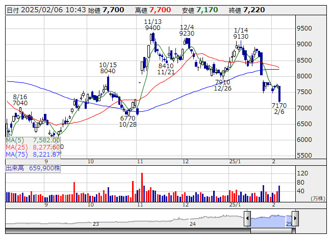 2025年02月06日10時42分 【材料】オルガノが急落、今期業績予想引き上げも受注高減額を嫌気 オルガノ <日足> 「株探」多機能チャートより オルガノ<6368>が急落している。5日の取引終了後、25年3月期第3四半期累計(4~12月)の連結決算発表にあわせ、通期の業績予想を修正した。今期の売上高予想を1650億円から1675億円(前期比11.4%増)、最終利益予想を215億円から230億円(同32.9%増)に上方修正した。一方、受注高については電子産業分野の大型案件で、受注見込み時期が後ろ倒しになった影響で、これまでの予想に比べて8.8%減の1550億円に見直しており、嫌気されたようだ。 電子産業分野や一般産業分野のソリューション事業の売り上げが想定よりも増加した。プラント事業の利益率の改善効果も業績予想に織り込んだ。4~12月期の売上高は前年同期比8.9%増の1156億9800万円、最終利益は同36.2%増の139億6500万円となった。 出所:MINKABU PRESS