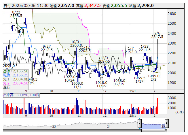 【テク】本日の【均衡表|3役好転/逆転】前場 好転= 95 銘柄 逆転= 31 銘柄 (2月6日)