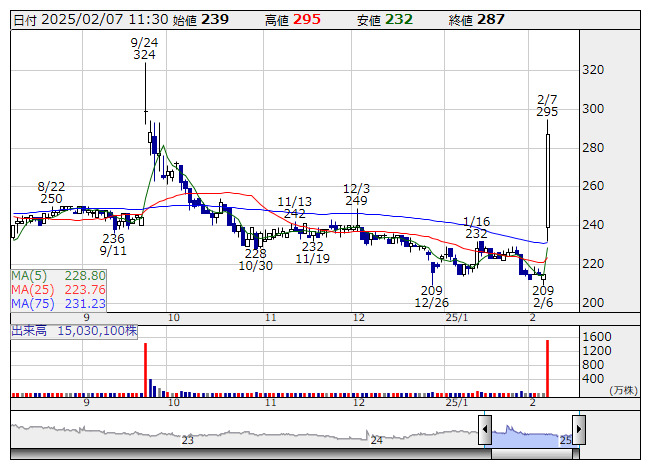 <4512> わかもと製薬 287 +72 (+33.5%) 228.8 223.8