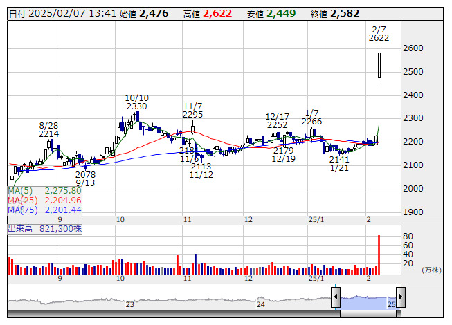1926>は大幅続伸。前日に第3四半期の決算を発表、累計営業利益は94.2億円で前年同期比11.2%増となり、上半期実績の同4.6%増から増益率は拡大。通期予想は137億円、前期比21.8%増を据え置いている。同時に、発行済み株式数の7.29%に当たる330万株、70億円を上限とする自己株式の取得実施を発表。取得期間は2月7日から12月30日までとしている。取得株式は全株消却予定。高水準の自社株買いを高評価する流れとなっている。