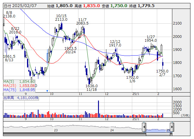 24年12月期業績見込みを上方修正で6日買われる。7日は売り優勢。