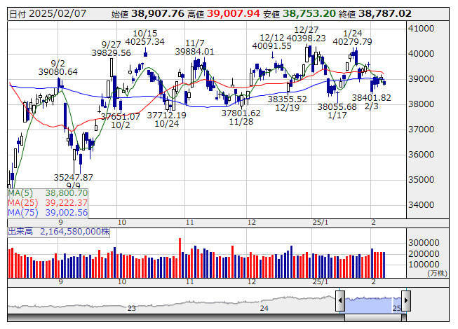 2025年02月10日08時46分 【市況】日経225先物:10日寄り付き=290円安、3万8550円 日経平均 <日足> 「株探」多機能チャートより 10日8時45分、大阪取引所の日経225先物期近2025年3月限は前週末清算値比290円安の3万8550円で寄り付いた。前週末の日経平均株価の現物終値3万8787.02円に対しては237.02円安。 株探ニュース