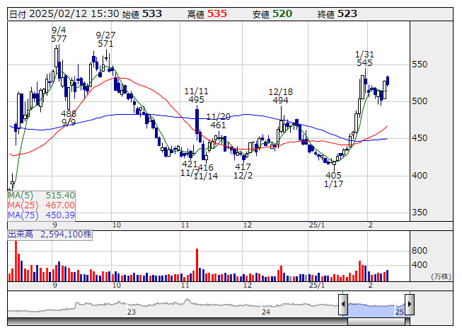 2025年02月12日16時30分 【材料】アイスタイル、今期上方修正で7期ぶり営業最高益へ アイスタイル <日足> 「株探」多機能チャートより アイスタイル<3660>はこの日の取引終了後、25年6月期連結業績予想について売上高を前期比17.7%増の660億円(従来予想640億円)、営業利益を同44.3%増の28億円(同24億円)へ上方修正すると発表した。営業利益は7期ぶりに過去最高を更新する見通しとなった。 マーケティング支援事業で大手化粧品ブランドだけでなく中堅・新興ブランドとの取引高が計画よりも拡大したことや、リテール事業で新規出店や既存店改装、販売イベントが奏功したことが業績を押し上げる。あわせて、年内をメドに香港で海外初となる旗艦店をオープンすることを明らかにした。 出所:MINKABU PRESS