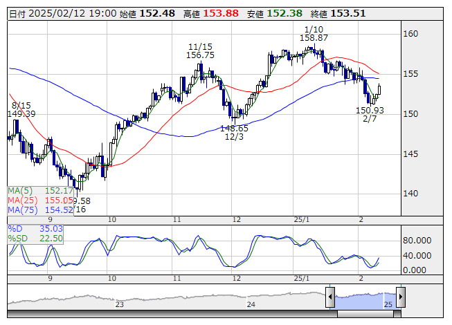 2025年02月12日19時01分 【通貨】外為:1ドル153円50銭前後とドル安・円高で推移 米ドル/円 <日足> Slowストキャス 「株探」多機能チャートより 12日の外国為替市場のドル円相場は午後7時時点で1ドル=153円50銭前後と、午後5時時点に比べ18銭のドル安・円高。ユーロ円は1ユーロ=159円22銭前後と20銭のユーロ安・円高で推移している。 株探ニュース