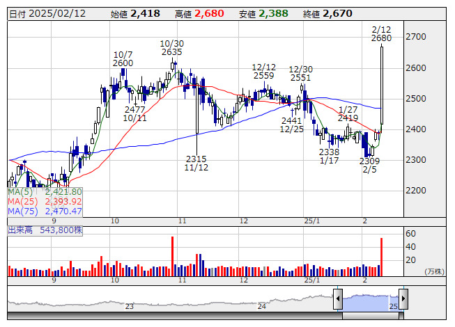 古河機械金属<5715> 2488 +460