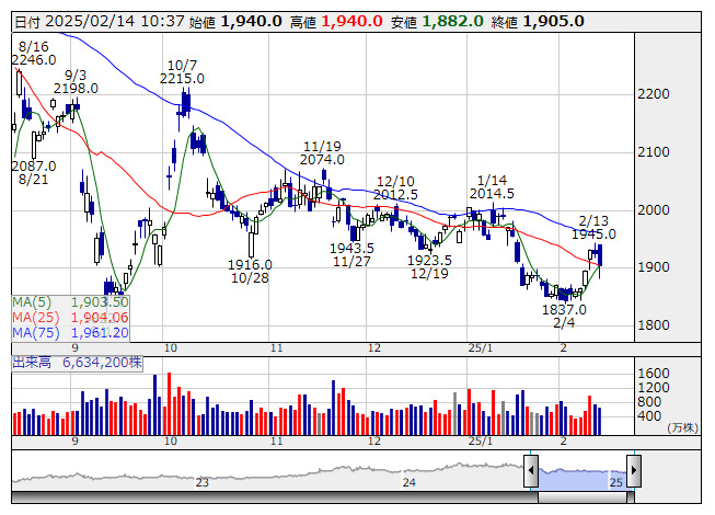 5020>が安い。前日の13日の米原油先物相場はWTI(ウエスト・テキサス・インターミディエート)の3月限が前日比0.08ドル安の1バレル=71.29ドルと下落した。ロシアによるウクライナ侵攻に対する停戦交渉に向けた動きが強まるなか、ロシア原油の供給増を見込んだ売り物が先行した。天然ガス価格も下落しており、INPEXやENEOSといった資源・エネルギー株は軟調な値動きとなっている。