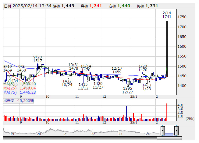 7039>が後場に入りストップ高の水準となる前営業日比300円高の1741円でカイ気配となった。14日正午、24年12月期の連結決算発表にあわせ、株主還元方針の変更を発表。配当性向50%以上を目標として累進配当を導入するとの方針を打ち出した。これを踏まえ、25年12月期の年間配当予想を85円(前期比50円増配)とし、材料視されたようだ。今期の業績予想についてはレンジで開示した。売上高は前期比10.0~20.0%増の94億7700万~103億3800万円、最終利益は同3.8%減~4.8%増の6億3100万~6億8800万円となる見通しを示している。