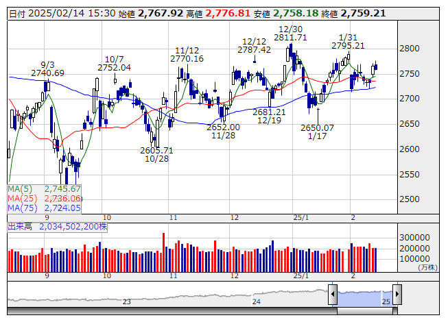 2025年02月14日15時47分 【市況】TOPIX先物:14日清算値=15.5ポイント安、2753.5ポイント TOPIX <日足> 「株探」多機能チャートより 14日15時45分、TOPIX先物期近2025年3月限は前日清算値比15.5ポイント安の2753.5ポイントで取引を終えた。出来高は4万2838枚だった。この日のTOPIXの現物終値2759.21ポイントに対しては5.71ポイント安。 株探ニュース