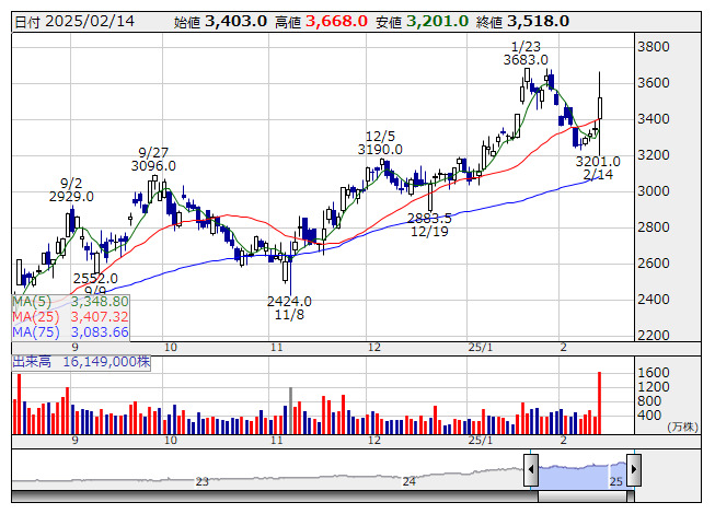 アシックス <日足> 「株探」多機能チャートより銘柄名<コード>14日終値⇒前日比