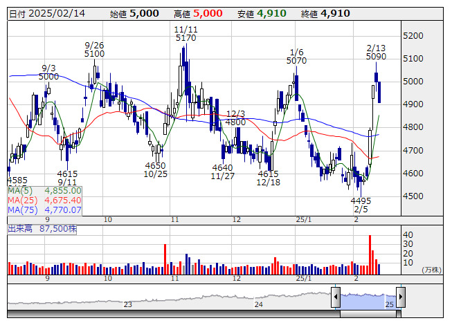 大気社 <日足> 「株探」多機能チャートより――――――――――――――――――― 2月10日 (月) 発表分――
