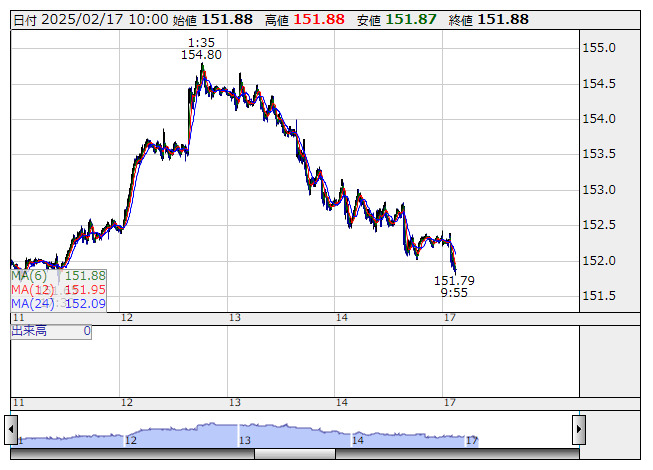 2025年02月17日10時01分 【通貨】外為:1ドル151円84銭前後と大幅なドル安・円高で推移 米ドル/円 <5分足> 「株探」多機能チャートより 17日の外国為替市場のドル円相場は午前10時時点で1ドル=151円84銭前後と、前週末午後5時時点に比べ88銭の大幅なドル安・円高。ユーロ円は1ユーロ=159円26銭前後と53銭の大幅なユーロ安・円高で推移している。 株探ニュース