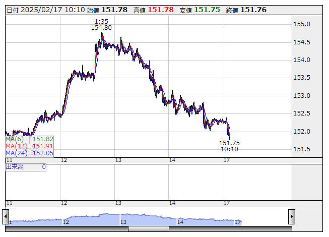 この日の東京市場もドル売り・円買いが優勢となっている。内閣府が朝方発表した24年10~12月期の国内総生産(GDP)速報値が、物価変動の影響を除いた実質が前期比年率2.8%増となったことで、日銀の早期利上げ観測が高まった。日経平均株価が続落していることも影響し、午前9時50分すぎには一時151円78銭をつけた。