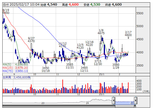 6871>はストップ高。先週末に24年12月期の決算を発表、営業利益は126億円で前期比2.4倍となり、従来予想の116億円を上回る着地になっている。年間配当金も従来計画の65円から70円に引き上げ。また、25年12月期上半期の業績予想を公表しているが、営業利益は75億円で前年同期比30.1%増の見通しとしている。主力のプローブカード事業の高成長を想定しているもよう。想定以上の収益拡大ペースとして、株価の出遅れ感が見直される動きに。