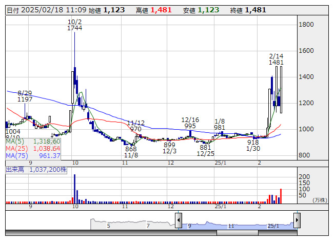イタミアート <日足> 「株探」多機能チャートより個別ではイタミアート<168A>がストップ高。Will Smart<175A>は一時ストップ高と値を飛ばした。Schoo<264A>、技術承継機構<319A>、はてな<3930>、シェアリングテクノロジー<3989>、ライトワークス<4267>など14銘柄は昨年来高値を更新。カオナビ<4435>、デ・ウエスタン・セラピテクス研究所<4576>、レントラックス<6045>、リスキル<291A>、トゥエンティーフォーセブン<7074>は値上がり率上位に買われた。