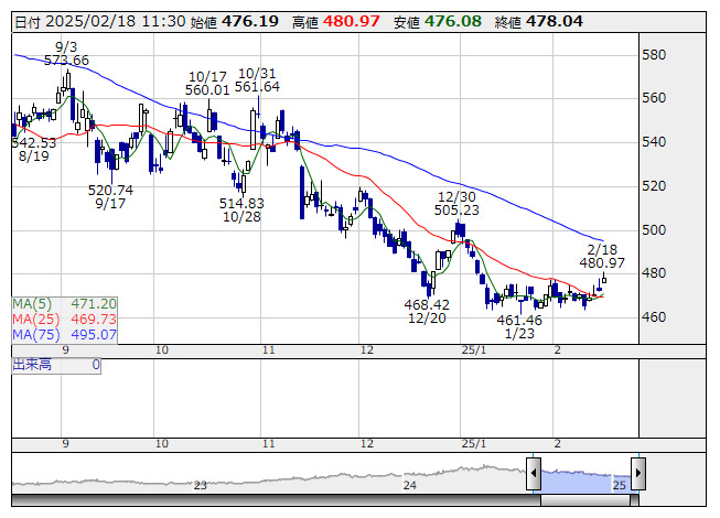 電気・ガス <日足> 「株探」多機能チャートより●東証33業種 値上がり: 16 業種 値下がり: 17 業種