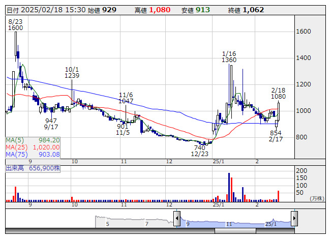 GMOペパボ<3633>は高い。17日取引終了後に自社株買いを実施すると発表した。取得上限は15万株(自己株式を除く発行済み株数の2.84%)、または1億8000万円。期間は2月18日から12月31日まで。これが好感された。