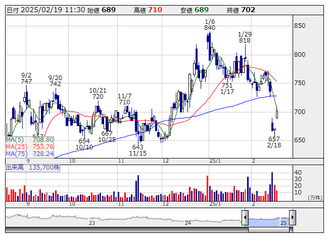 クロスマーケ <日足> 「株探」多機能チャートより免疫生物研究所<4570>=大幅高で3日続伸。18日の取引終了後、25年3月期の連結業績予想について、営業利益を1億2000万円から1億8000万円(前期比73.1%増)へ、純利益を1億1500万円から2億1500万円(同15.6%増)へ上方修正したことが好感されている。売上高は9億2500万円(同13.3%増)の従来見通しを据え置いたものの、抗体関連事業において利益率の高い主力製品である「アンジオテンシノーゲン(AGT)ELISA」や「Gd-IgA1 ELISA」が、海外CRO(医薬品開発業務受託)企業の治験に採用されていることや、国内外の体外診断用医薬品原料抗体の販売が大幅に増加したこと、更にコストの管理強化や効率的な使用に努めたことなどが利益を押し上げる。