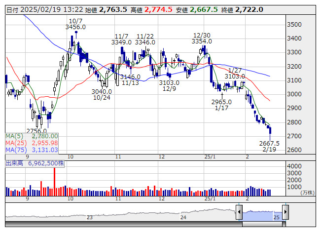 RIO>が事業開発を担う豪州の鉄鉱石事業の権益40%を取得すると発表した。取得額の合計は53億4200万ドル(約8000億円)となる見通し。財務面での負担などを懸念した売りが出たようだ。西豪州ピルバラ地域に位置し、68億トンの資源量を持つ世界最大級の未開発鉄鉱床に関する権益で、2030年までの生産開始を予定。持ち分権益生産量は初期生産体制で年間1600万トン、最終的に年間4000万トン以上を見込む。長期的な収益基盤の更なる強化につなげる方針。権益取得に伴って、三井物はキャッシュ・フロー・アロケーションの枠組みにおいて、追加資金4000億円をマネジメント・アロケーションに充当する予定という。マネジメント・アロケーションの残額は5500億円となり、引き続き厳選した成長投資と機動的な株主還元を検討していくとしている。