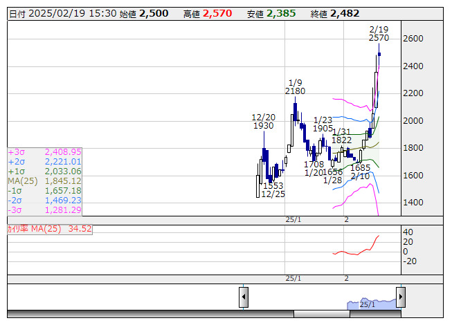 キオクシア <日足> ボリンジャー/カイリ率 「株探」多機能チャートより●株価が+3σを上回った銘柄(市場人気順) ★株価の上げ足が速過ぎ、売りが出やすい銘柄