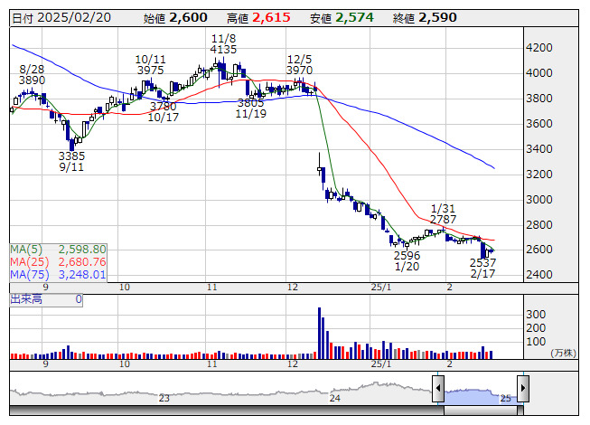 くら寿司 <日足> 「株探」多機能チャートより2月20日9時03分26秒現在、特別買い気配は21銘柄、特別売り気配は4銘柄となっている。
