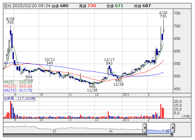 5287>が上げ足加速、一時13%高と値を飛ばし730円まで駆け上がった。昨年8月28日につけた昨年来高値705円をブレークし一気に新値圏に浮上している。マンホールなどのコンクリート2次製品を手掛けるが、ライン導水ブロックを中心とした道路関連製品が好調で収益を押し上げている。25年3月期は営業利益が前期比48%増益を見込むなど回復色を鮮明とする見通し。埼玉県八潮市の県道で起こった道路陥没事故を受け、今後水道インフラの予防保全や再構築に対する需要が顕在化するとの見方が高まっている。同社はその関連株の一角として、投資資金の流入が本格化しており需給相場の様相を見せ始めている。