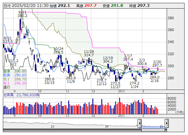 日経ベア2 <日足> 一目均衡表 「株探」多機能チャートより●一目均衡表の【雲】上抜け銘柄(市場人気順) ★2つの先行スパンに挟まれた上値抵抗帯を上抜けた銘柄