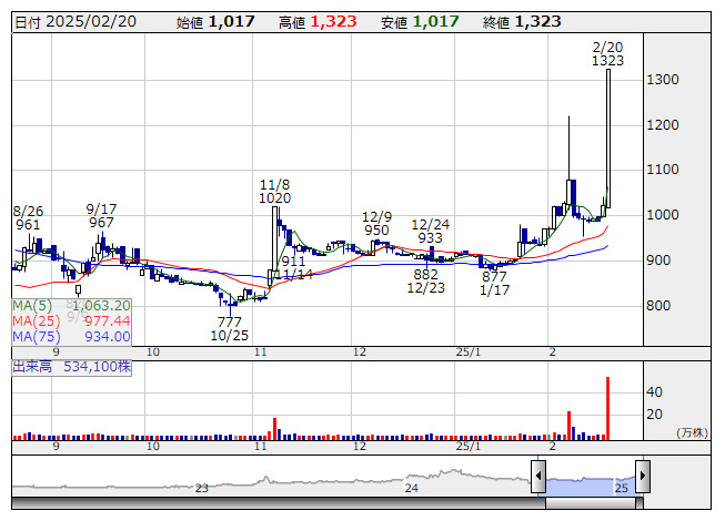 栗林船 <日足> 「株探」多機能チャートより■栗林船 <9171> 1,323円 (+300円、+29.3%) ストップ高