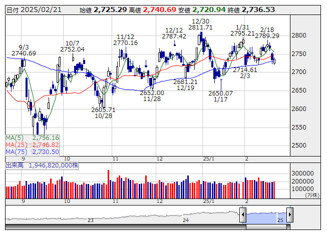 2025年02月25日08時46分 【市況】TOPIX先物:25日寄り付き=39.5ポイント安、2695.5ポイント TOPIX <日足> 「株探」多機能チャートより 25日8時45分、TOPIX先物期近2025年3月限は前週末清算値比39.5ポイント安の2695.5ポイントで寄り付いた。前週末のTOPIXの現物終値2736.53ポイントに対しては41.03ポイント安。 株探ニュース