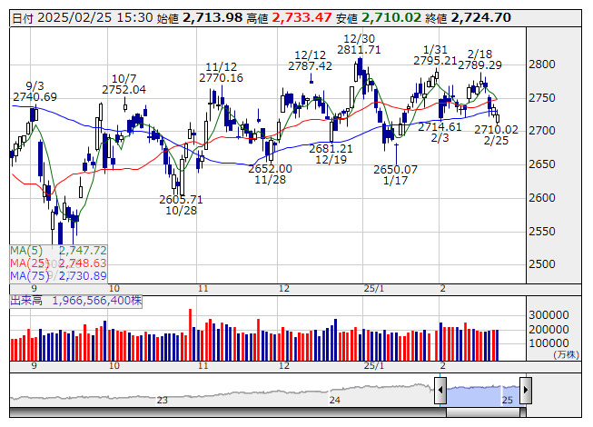 2025年02月25日15時47分 【市況】TOPIX先物:25日清算値=9.5ポイント安、2725.5ポイント TOPIX <日足> 「株探」多機能チャートより 25日15時45分、TOPIX先物期近2025年3月限は前週末清算値比9.5ポイント安の2725.5ポイントで取引を終えた。出来高は6万472枚だった。この日のTOPIXの現物終値2724.7ポイントに対しては0.80ポイント高。 株探ニュース
