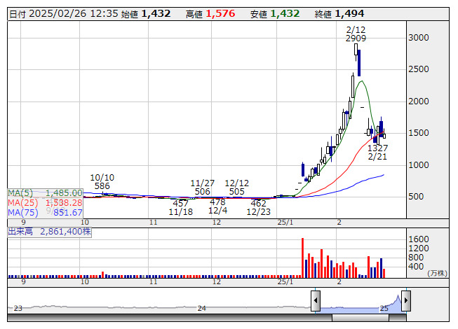 大幅に反発。AI学習によってクリエイターに対価が還元される実証実験を開始すると前日午前に発表している。実証実験で得られた知見をAI事業者や出版社・コンテンツホルダーと連携しながら、新たなエコシステムの構築を目指すという。前日は引けにかけて利益確定売りに押されたが、本日は押し目買いが入って上伸している。また、最近のnote株は25日移動平均線を挟んで推移しており、下値支持線として意識されているようだ。