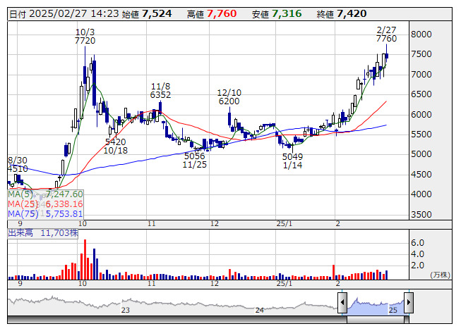 ハンセンブル <日足> 「株探」多機能チャートより27日の市場でハンセンブルが反落。同ETNは、香港ハンセン指数に対して2倍の値動きで連動する特徴がある。香港ハンセン指数は上昇基調を強めており、年初から2割近く上昇している。トランプ米政権は中国に10%の追加関税を発動したが、現時点では警戒されたほどの水準にはなっていないうえに、中国製AI「ディープシーク」に対する期待で中国テック企業に買いが入っていることも追い風に働いている。ただ、ハンセンブルには年初からの上昇で高値警戒感も台頭している様子だ。