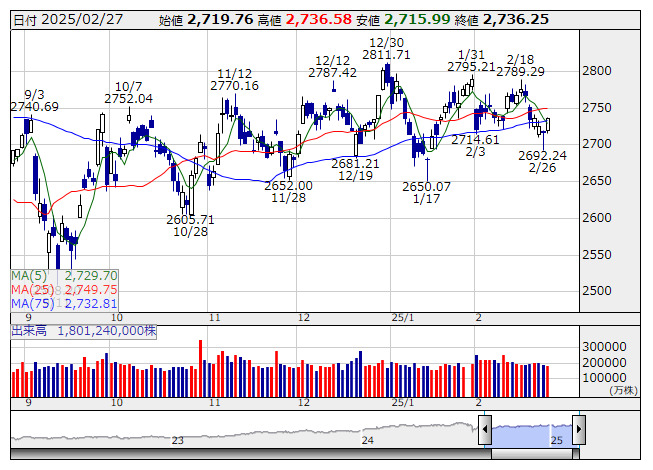 2025年02月28日08時46分 【市況】TOPIX先物:28日寄り付き=30.5ポイント安、2708ポイント TOPIX <日足> 「株探」多機能チャートより 28日8時45分、TOPIX先物期近2025年3月限は前日清算値比30.5ポイント安の2708ポイントで寄り付いた。前日のTOPIXの現物終値2736.25ポイントに対しては28.25ポイント安。 株探ニュース