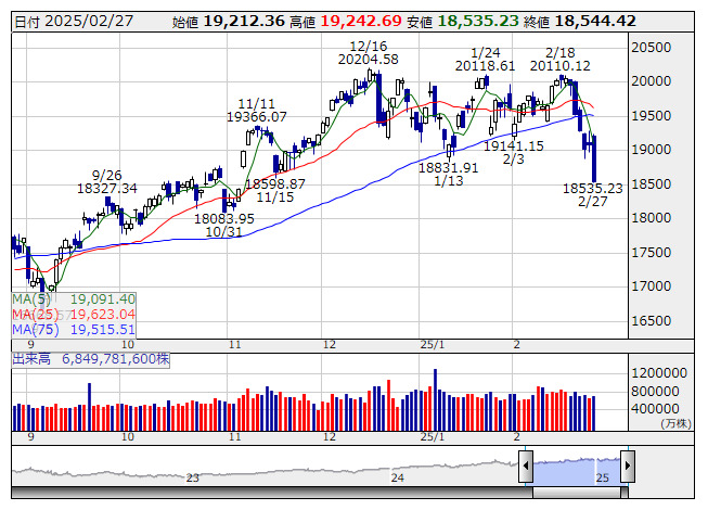 コアPCE価格指数が想定通りインフレ鈍化基調を証明したが、ハイテクが弱く、寄り付き後、まちまち。その後、米国とウクライナ首脳会談の決裂で期待されていた資源取引を巡り正式合意が成立せず停戦期待の後退で、ダウは下落に転じた。ただ、月末で、さらに、インフレ鈍化の進展に伴う利下げ期待を受けた買い戻しが強まり、相場は再び上昇。ハイテクも買い戻され、終盤にかけ相場は上昇幅を拡大し、終了した。セクター別では、自動車・自動車部品、半導体・同製造装置が上昇した一方で、不動産管理・開発が下落。