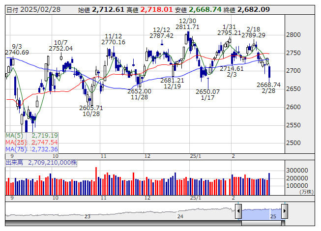 TOPIX <日足> 「株探」多機能チャートより2822.04ポイント ボリンジャーバンド3σ