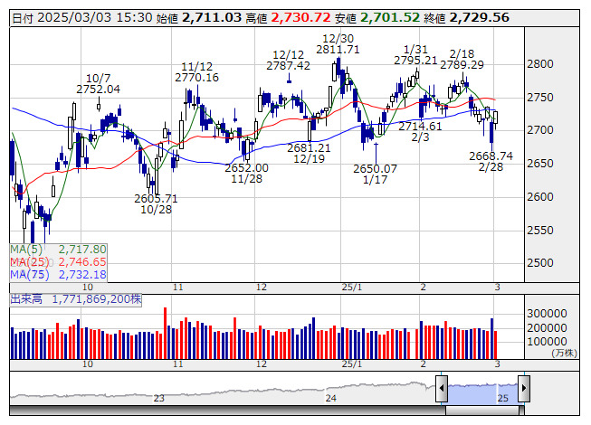 TOPIX <日足> 「株探」多機能チャートより日本取引所が公表した先物手口情報によると、3月3日のTOPIX先物期近(2025年3月限)の夜間取引(立会内・J-NETの合算)で、取引高トップはABNクリアリン証券の1万4073枚だった。