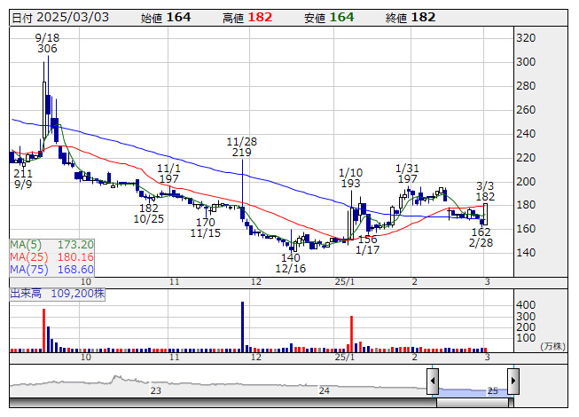 ボードルア <4413> 4,995 +285 ( +6.1%) 5,800 ( 2,900) 5,400 ( 2,697)