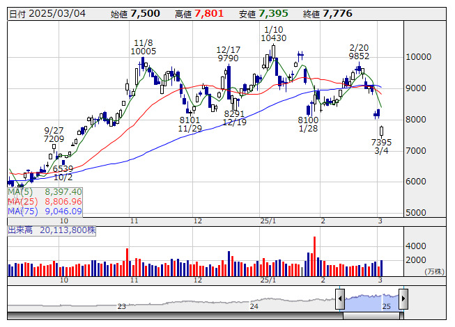アドテスト <日足> 「株探」多機能チャートより銘柄名<コード>4日終値⇒前日比
