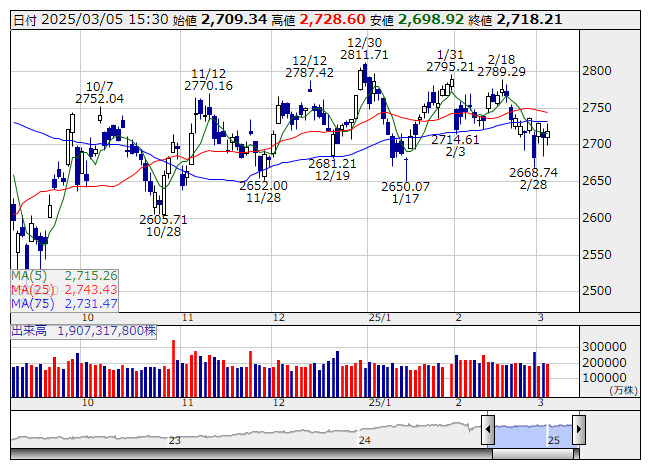 2025年03月05日15時47分 【市況】TOPIX先物:5日清算値=10.5ポイント高、2721.5ポイント TOPIX <日足> 「株探」多機能チャートより 5日15時45分、TOPIX先物期近2025年3月限は前日清算値比10.5ポイント高の2721.5ポイントで取引を終えた。出来高は6万8334枚だった。この日のTOPIXの現物終値2718.21ポイントに対しては3.29ポイント高。 株探ニュース