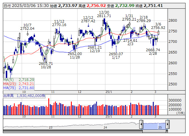 2025年03月06日15時47分 【市況】TOPIX先物:6日清算値=33.5ポイント高、2755ポイント TOPIX <日足> 「株探」多機能チャートより 6日15時45分、TOPIX先物期近2025年3月限は前日清算値比33.5ポイント高の2755ポイントで取引を終えた。出来高は5万5676枚だった。この日のTOPIXの現物終値2751.41ポイントに対しては3.59ポイント高。 株探ニュース