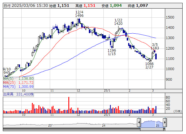 チヨダ <日足> 「株探」多機能チャートより■チヨダ <8185> 1,097円 (-69円、-5.9%)